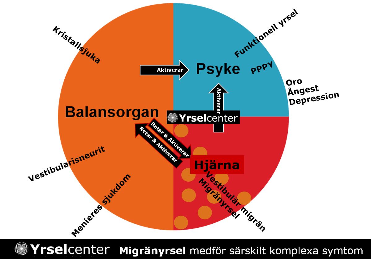 Migränyrsel medför ofta många och komplexa symtom som ofta feltolkas i allmän sjukvård. Hjärnsjukdomen migrän är i sig en komplex störning men den aktiverar dessutom störningar av balansorganen. Och störningar i hjärna och balansorgan aktiverar sekundära funktionella, psykologiska och psykiska störningar.